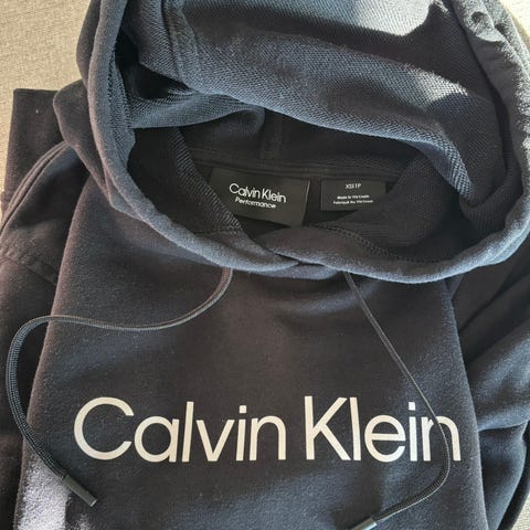- Calvin Klein tummansininen mekkohuppari kultaisilla yksityiskohdilla. Käytöntuomaa nyppyä havaittavissa. Kengurutasku edessä.