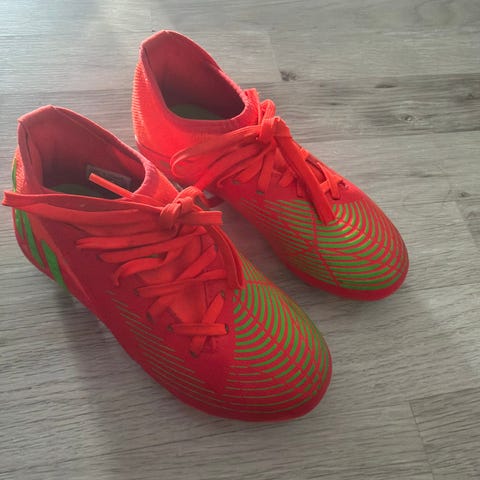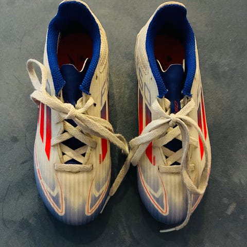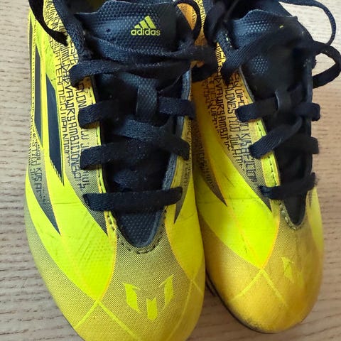 Adidas jalkapallokengät, nappulakengät lapselle. Kengät ovat väriltään kultamustat valkoisilla raidoilla. Pohjassa on muoviset nappulat, jotka soveltuvat erityisesti nurmikentille. Koko on EU 30 (FR 30, JP 180, CHN 180). Nauhakiinnitys.
