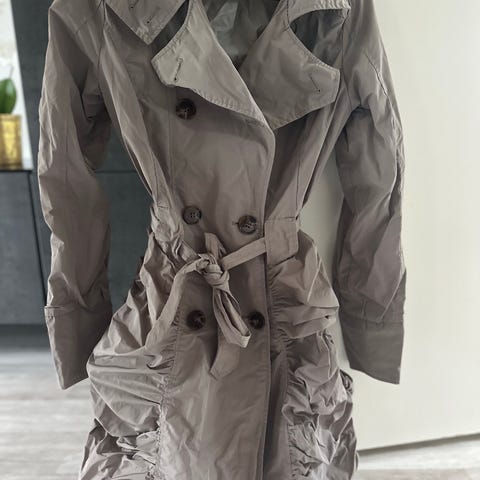 Musta vuoreton Pieces takki / trenssitakki kokoa L. Joustavaa kangasta. Pituus noin 120cm, kai-kai noin 61cm. Kiinnitys vyöllä. Erinomainen kunto.