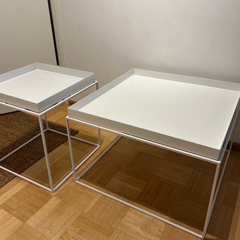 Valkoinen Hay Tray -pöytä, koko 60x60. Pöydän pinnassa on tavallisia käytöstä johtuvia hiusnaarmuja ja jaloissa hieman robotti-imurista tulleita mustia jälkiä. Jaloissa olevat jäljet saattaisi lähteä poiskin puhdistamalla. Pöydän yleisilme on siisti.
