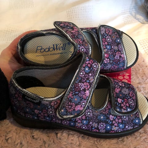 PodoWell on ortopedinen, lääkinnällinen sandaali, jolla on CE-merkintä. Tämä kenkä on suunniteltu tukemaan ja helpottamaan esimerkiksi turvotusta, reumaa, tulehduksia tai leikkauksen jälkeistä toipumista. Tässä mallissa on paljon tilaa jalalle, ja sen istuvuutta voi helposti säätää kahden tarran avulla. Tarvittaessa sandaalin saa myös kokonaan auki. Pohjallisen voi vaihtaa omaan yksilölliseen pohjalliseen. Kengät sopivat hyvin sekä sisä- että ulkokäyttöön. Pohjallisen pituus 27.5cm.