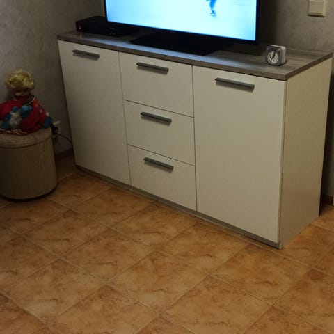Senkki tai TV-taso ja säilytyskaluste tummanruskeaa puuta. Keskiosassa on taso televisiolle sekä useita vetolaatikoita ja kaapistot ovilla. Sopii olohuoneeseen tai muuhun tilaan, jossa tarvitaan TV-tasoa ja lisäsäilytystilaa.
