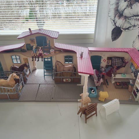 Schleich erittäin siisti ratsastuskauppa. Setti sisältää kuvien mukaiset tarvikkeet, mm. koiran, hevosen ja ihmiset. Tarvikkeita on runsaasti, jotka näkyvät hyvin kuvissa. Tällä lelulla on kiva leikkiä ja laajentaa sitä halutessa esim. eläimillä ja hoitotarvikkeilla. Puuhastelua riittää.