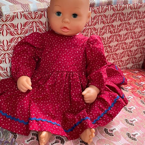 Babynukke, jolla on yllään punavalkoinen pehmeä potkupuku ja kuviollinen paita. Nukella on suussa tutti ja mukana tulee myös toinen tuttiSopii lasten leikkeihin ja roolileikkeihin hoivattavaksi vauvanukeksi.