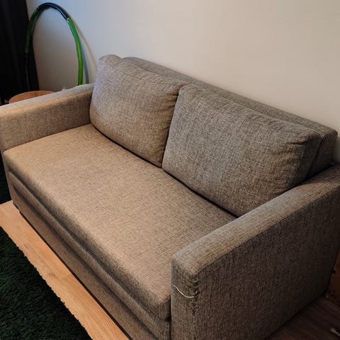 Tampereen Hatanpäällä myynnissä harmaa vuodesohva. Ollut käytössä muutama vuosi ja sohva hyvässä kunnossa. Alareuna hieman irti säilytyslaatikosta, mikä vaikuttaa vuoteen avaamiseen, mutta ei vaikuta sohvan tai vuoteen laatuun.