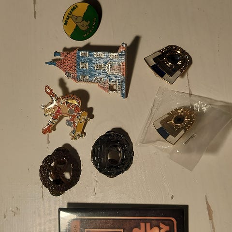 6 kpl erilaisia pinssejä.Puinen kettu ja kala.Suomen luonnonsuojeluliiton pinssi.Pöllö.Oma taimen ja maisema prinssi.postitus onnistuu