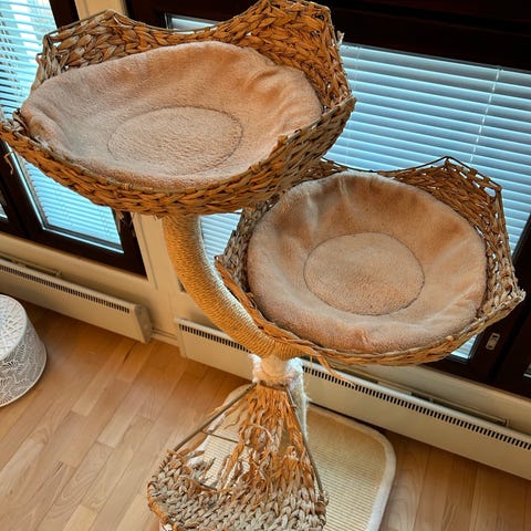 Kokonaisuus kissan tarvikkeita. Pakettiin kuuluu kaksi erikokoista raapimispuuta, korkea kiipeilypuu usealla tasolla ja makuupaikalla, kuljetusboksi, katollinen hiekkalaatikko, pitkä leikkitunneli sekä kaksi valkoista ruokakuppia.