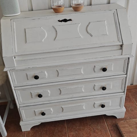 Puinen kirjoituslipasto, jossa on kaapistoon taittuva kirjoitustaso. Lipastossa on useita vetolaatikoita ulkopuolella sekä pienempiä laatikoita ja hylly sisäpuolella pientä säilytystä varten. Vaalea puupinta ja kaarevat jalat. Sopii esimerkiksi työpisteeksi tai säilytyskalusteeksi olohuoneeseen, makuuhuoneeseen tai työhuoneeseen.