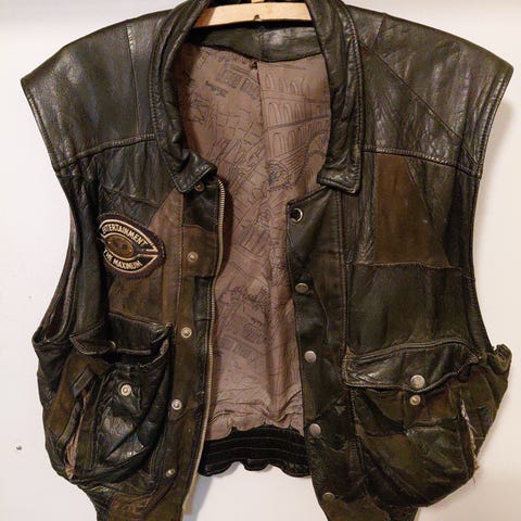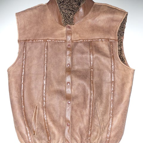 Vuorellinen vintage nahkaliivi. Liivissä normi taskut ja rintatasku. Vetoketju kiinnitys. Koko ~XL.