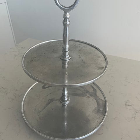 Lasinen kerrostarjotin, jonka kokonaiskorkeus on 26 cm (sis. kädensijan). Pienemmän lasilautasen halkaisija on 25 cm ja suuremman 31,5 cm. Ollut kaksi kertaa käytössä, joten pientä käytönjälkeä on. Ei haittaa tulevaa käyttöä. Saa purettua osiin. Kaikki osat tallella.