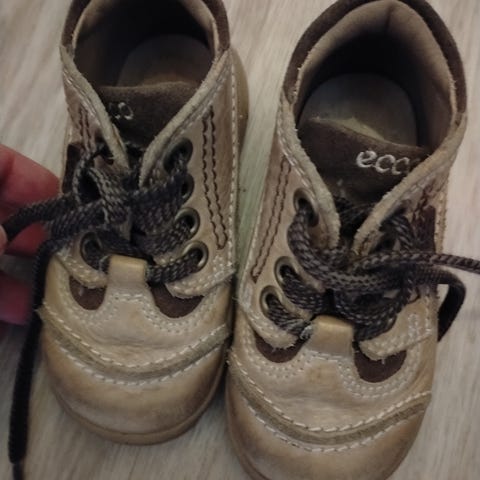ECCO lasten kengät, koko 20. Unisex-malli. Kengät ovat ruskeat, joissa on tummat nauhat ja vaalea kumipohja. Nauhakiinnitys mahdollistaa säätämisen jalkaan sopivaksi. Sopivat arkeen ja ulkoiluun pienelle lapselle.
