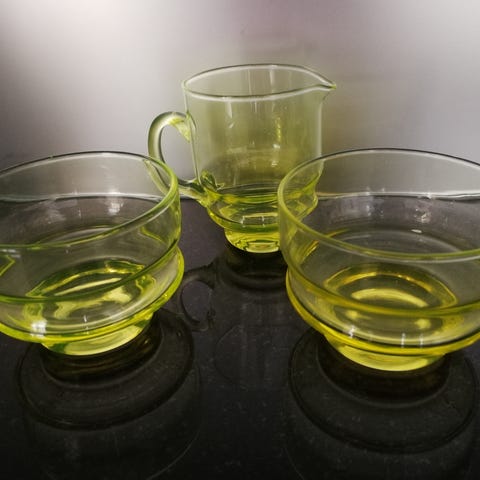 Riihimäen lasin Erkki kermakko ja sokerikko. Keltaista lasi, ehjät ja moitteettomasti kunnossa.