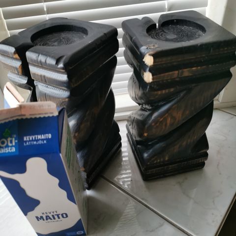 Puinen kynttilänjalkasetti, jossa 3 erikorkuisia kynttilänjalkoja. Kynttilänjalat on maalattu pastellisävyillä, kuten vaaleanpunaisella, vaaleansinisellä ja vaalealla harmaalla. Korkein n 70cm korkea. Osassa kynttilänjaloista on perinteinen paikka kynttilälle ja yhdessä maljamainen yläosa, jota voi käyttää esimerkiksi tuikkukupille tai pienenä kulhona koristekäyttöön. Sopii sisustukseen esimerkiksi pöydälle, tasolle tai ikkunalaudalle ryhmäksi aseteltuna. Seinäjoki tai lähetys 15€ (isossa paketissa) - katso myös muut kohteeni