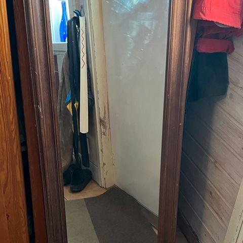 66cm leveä ja 76cm korkea puinen peili. Oikeassa yläkulmassa pieni kolhu ja alareunassa pieni naarmu. Saa varmasti esim tussilla piiloon jos häiritsee.