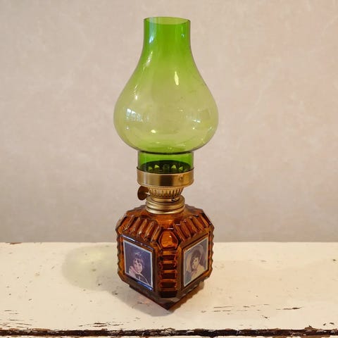 öljylamppu vihreää kohokuvioitua lasia. Lampussa on vihreä lasinen jalka ja säiliö, metallinen poltinosan kiinnike sekä merkintä "Made in Portugal" jalustassa. Sopii käytettäväksi perinteisenä öljylamppuna tai sisustuselementtinä. Huomioitava, että lasikupu meni rikki, ja semmoinen tarvi hankia erikseen.