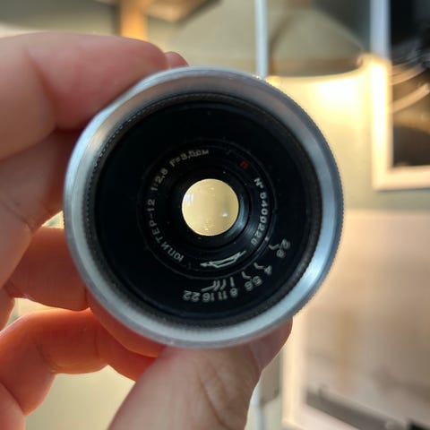 Neuvosto kopio Carl Zeiss Sonnar objektiivista KMZ tehtaalta, kunto hyvä, rungossa reippaasti kulumaa mutta lasit puhtaat pientä pölyä lukuunottamatta. Tämä siis mittaetsin M39 leica kierteillä. Aukko rinkula näyttää f22 kohdalla f16 ja f2 menee asteikon yli noin yhden pykälän. Ei tulppia.