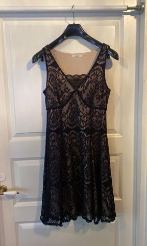 Naisten musta pitsinen juhka-asu, koko 40. Koostuu erillisestä paita ja hameosasta. Kukkakuvioinen pitsipäällinen ja vaalea aluskerros, jotka muodostavat kaksikerroksisen ilmeen. Helma ja yläosan reunat on viimeistelty pitsisomisteilla. Sopii esimerkiksi juhla- tai iltakäyttöön.