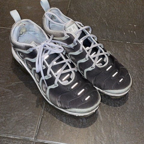 Nike Air Vapormax Plus tennarit, koko 42,5. Kengät hyvässä kunnossa muuten, mutta kärjessä näkyy muutama pieni repeämä/reikä.