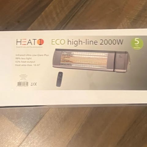 Heat ECO High-Line 2000W terassilämmitin. Sähköinen lämmitin, jonka teho on 2000 W. Soveltuu terassin tai parvekkeen lämmitykseen. Laitteessa on suojaritilä ja mukana tulee kaukosäädin. Toimitetaan alkuperäisessä pakkauksessa ohjekirjan kanssa.