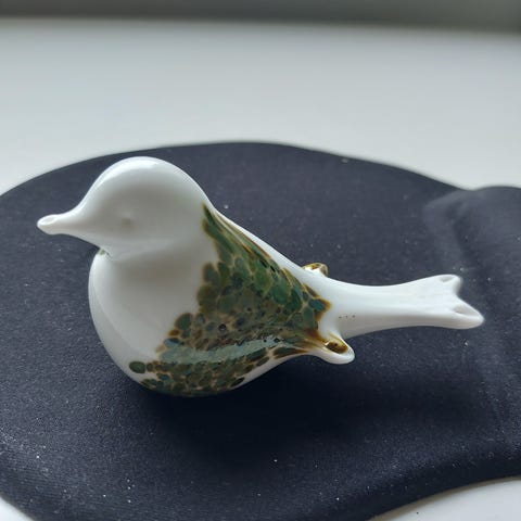 Pieni (pituus 14 cm korkeus 7 cm) Nuutajärven tehtaan lasilintu. Täysin ehjä, ei signeerattu.