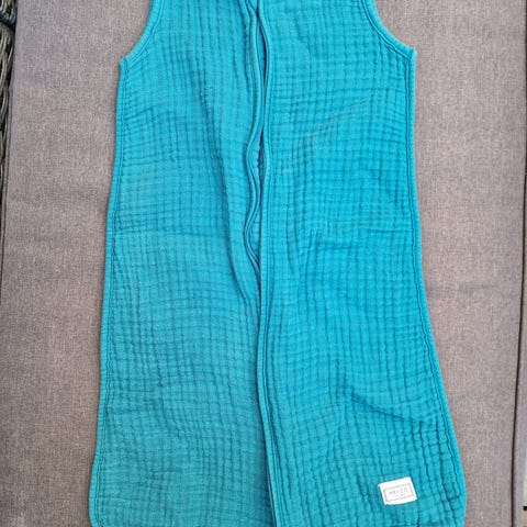 Ohutta vaaleansinistä kuviollista musliinikangasta oleva unipussi. Tog ~0.5, lapsen pituuteen 60cm saakka. Käytetty lisälämmikkeenä Lodgerin paksumman unipussin alla viileillä keleillä.