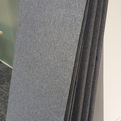 Työpisteitä yhteensä neljä. Mukaan korkeussäädettävä pöytä, kapea ja leveä sermi sekä erittäin hyvä harmaa työtuoli.