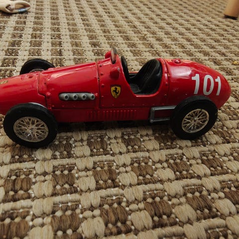 Kuvam mukaiset Pienoismalliset lelut, joihin kuuluu punainen kilpa-auto ja punainen helikopteri. Molemmat ovat metallisia ja pienikokoisia, soveltuvat esimerkiksi kokoelmaan tai leikkikäyttöön. Autossa on numero 26 ja avoin ohjaamo, helikopterissa pyörivä roottori ja laskutelinepyörä. Väri molemmissa tummanpunainen. Auto on Ferrari 1955 750 Monza, scale 1/36.