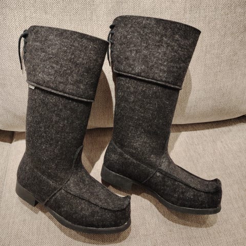 Käsin huovutettu 100% lampaanvilla. Väri tummanharmaa/musta. Koko 40, pohjallinen n.25.7cm.