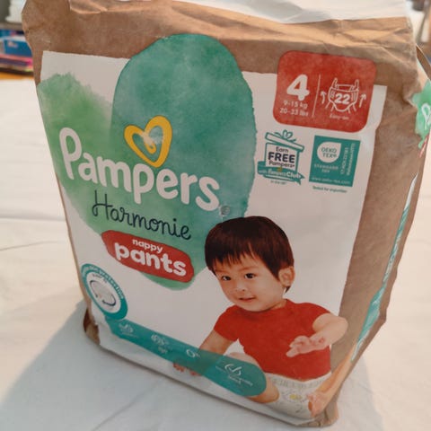 Uusi avaamaton Pampers-vaippapaketti kokoa 4 9-15kg:n painoisille lapsille housuvaippoja.