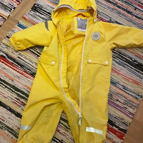 Reima haalari lapsille, koko 86 cm. Väri keltainen. Materiaali pääosin polyesteriä, kalvo polyuretaania ja vuori sekä vanu polyesteriä. Haalarissa on huppu, pitkät hihat ja lahkeet sekä heijastinnauhat lahkeissa. Unisex-malli, sopii sekä tytöille että pojille.
