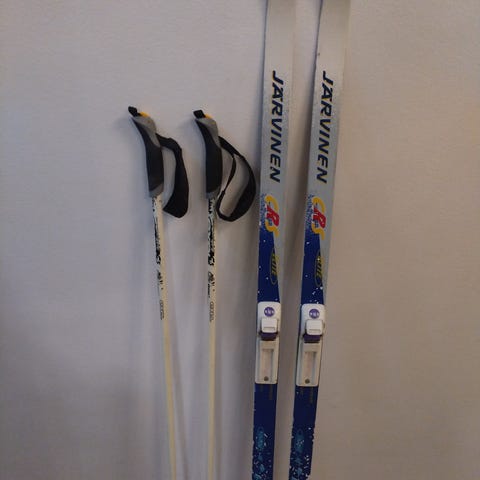 Lasten suksipakettia n.130cm hiihtäjille. Sukset 140cm, mono 34, sauvat 107cm