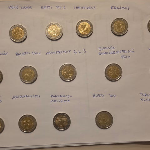 Myydään parhaalle tarjoukselle suomalaisia kierrosta kerättyjä erikois 2 e kolikoita 100 kpl nimellisarvo 200 e