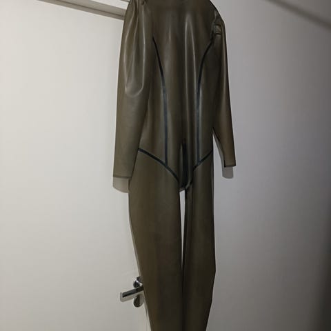 Myytävänä kuvienmukainen käyttämätön kumi puku YKK:n etuvetoketjulla ulottuen taakse asti vähän haarovälin yläpuolelle ja yhteensä kolmella vetimellä. Kumin paksuus 0,4 mm ja premium-laadun "metallic black" -sävyllä. Puvusta kuitenkin mainittava, että edessä vasemmalla on samea alue. Tämä näkyy hyvin tokassa kuvassa, kun tuo kohta siinä ilman kiillotusta. Kiillottamista voisi tuohon kokeilla vielä lisääkin, vähän levitinkin siihen silikonia (ja näyttääkin paremmalta ekassa kuvassa). Muuta vikaa puvussa ei siis ole.