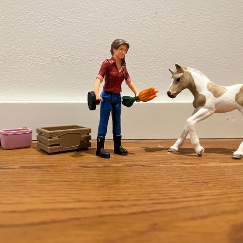 Schleich hevostalli ja hevoshahmo leikkisetti. Settiin kuuluu avattava vaunu, jossa on sisätiloissa sohva ja pöytä sekä ulkopuolella terassimainen alue. Mukana on hevoshahmo sekä ratsastajahahmo sekä muuta kuvassa näkyvää tavaraa