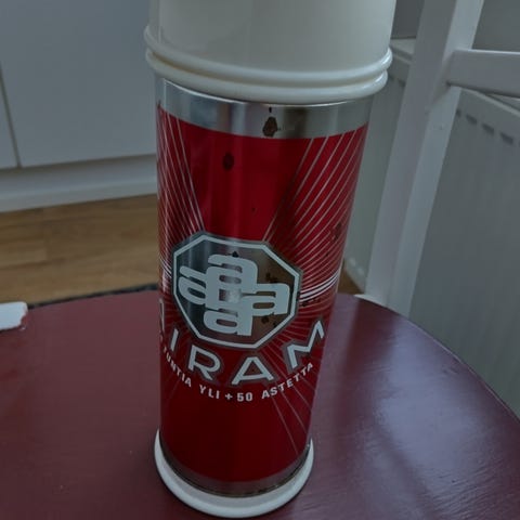 Punainen retro termari. Tilavuus 1l. Jotain kulumaa ulkopinnassa mutta yleisilme oikein siisti. Sisältä hyväkuntoinen. Pohjassa nimikointi. Muovinen kansi värjääntynyt hieman todennäköisesti kahvista. Aivan ihana punainen vanha termoskannu!