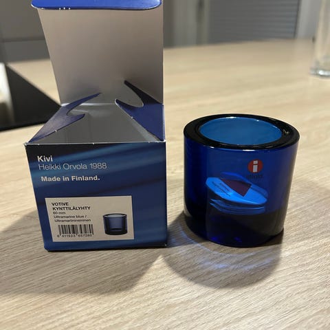 Iittala Kivi kynttilälyhty, suunnittelija Heikki Orvola 1988. Malli on valmistettu laventelin värisestä lasista ja sen korkeus on 60 mm. Mukana alkuperäinen pakkaus, jossa näkyy tuotetiedot ja väri laventeli.