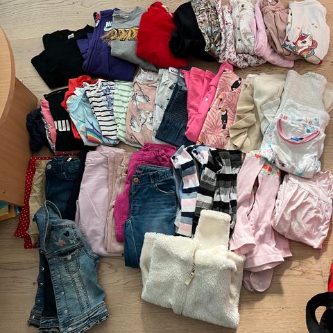 Pieni vaatesetti tytölle koossa 122-128cm. Pop&Co mekko, 2xhousut, teeppari, aito Nike hihaton paita (jota voi pitää myös tunikana) sekä pyjama.
