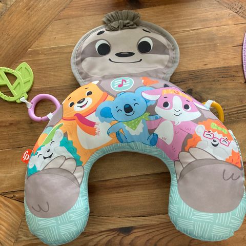 Fisher-Price vauvan leikki-vatsatyyny leluilla. Pehmeä U-muotoinen tyyny tukee vauvaa vatsallaan tai selällään. Yläosassa on lelukaarimainen osa, jossa useita irrotettavia leluja. Kuosissa värikkäitä eläin- ja luontokuvioita. Lelujen alla oleva kangas rapisee. Soveltuu vauvan leikki- ja harjoitteluhetkiin lattialla tai muulla tasaisella alustalla.