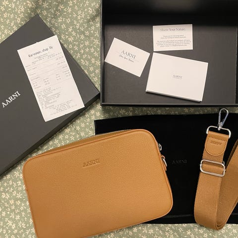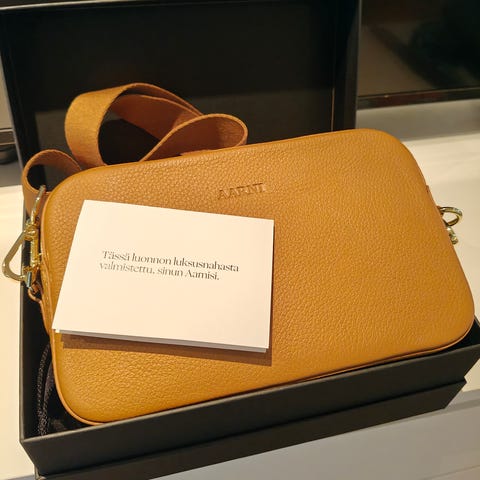 Aarnin iso olkalaukku kultaisilla yksityiskohdilla. Pois kaapista pyörimästä kun ei ole tullut aikoihin käyttöön. Pientä käytönjälkeä näkyy, mutta on edelleen todella hyväkuntoinen. 🥰