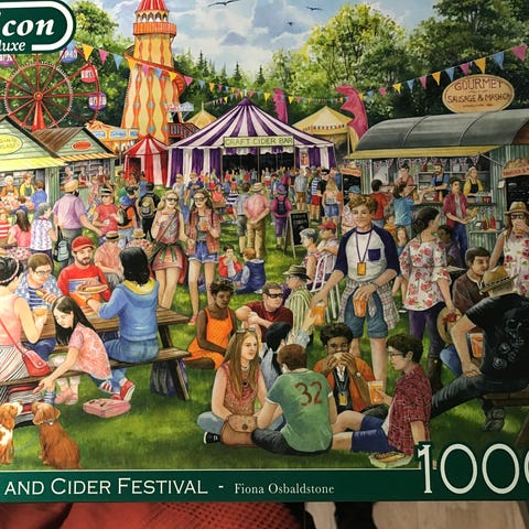 Falcon de luxe Sausage and Cider Festival -palapeli, jossa on 1000 palaa. Kuvassa on värikäs ulkoilmatapahtuma, jossa on ihmisiä, kojuja ja huvipuistolaitteita festivaalialueella. Palapeli on tarkoitettu aikuisille ja vanhemmille lapsille, jotka pitävät yksityiskohtaisista ja monivärisistä kuvista. Soveltuu kokoamiseen yksin tai yhdessä perheen ja ystävien kanssa.