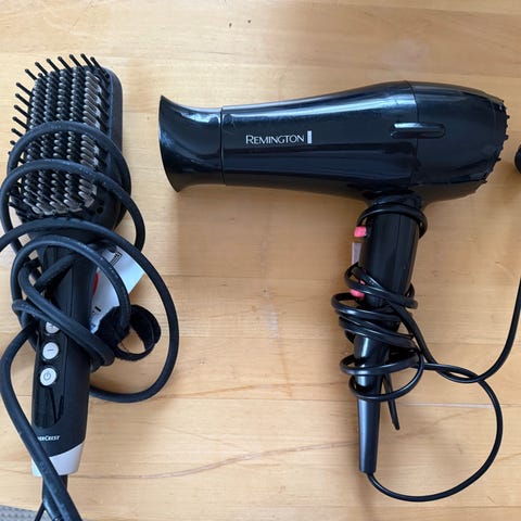 Remington hiustenmuotoilurauta ja Braun Satin Hair 1 -hiustenkuivain. Hiustenmuotoilurauta on musta ja soveltuu hiusten suoristamiseen ja muotoiluun. Braun Satin Hair 1 -hiustenkuivain on valkoinen ja siinä on useita lämpö- ja puhallusasetuksia. Molemmat laitteet toimivat verkkovirralla ja sopivat päivittäiseen hiusten kuivaamiseen ja muotoiluun kotikäytössä.