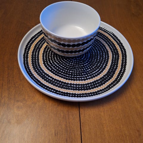 4 kuppia 2,5dl, 4 kulhoa 5dl, 4 lautasta 20cm. Kahdessa lautasessa särö, pieni palanen lähtenyt reunasta