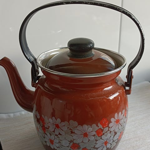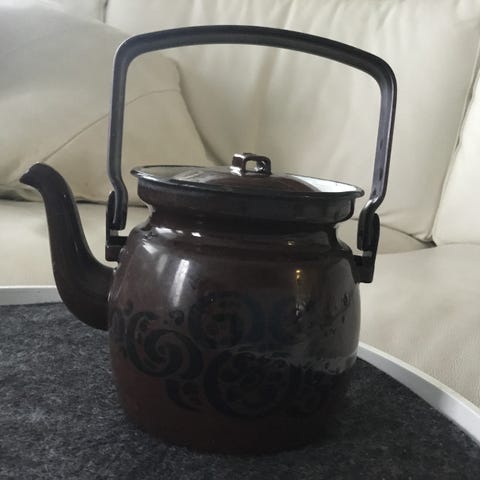 Villiruusu-kahvipannu. Sisältä siisti, kahvasta maali lähtenyt paikoin pois. Huomioitu hinnassa.