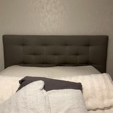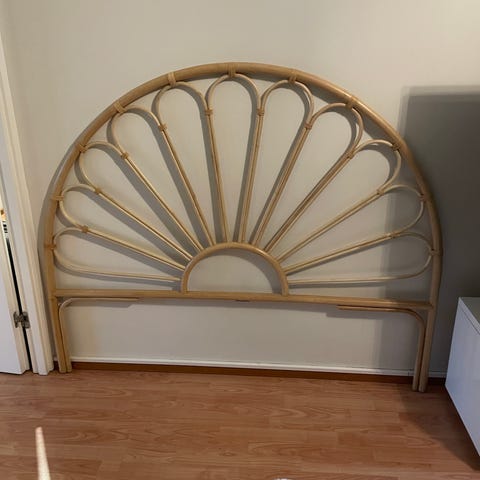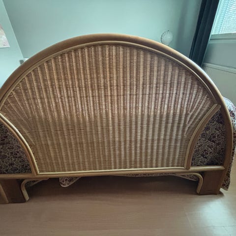 Mustaksi maalattu rottinki sängynpääty. Muuten hyvässä kunnossa paitsi kuvassa näkyvä kohta. Nouto.