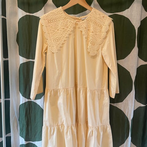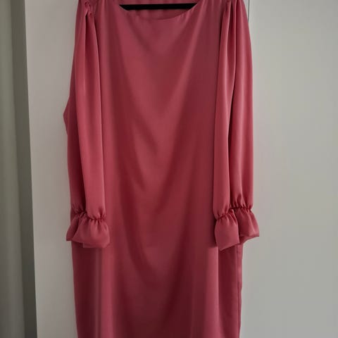Tummansininen mekko. Kai-kai 50. Pituus 95 cm. Puhvihihat. Kangas ryppymäistä, ei silitystä.Röyhelöhelma. V- aukko. Napitus edessä. Rintojen alla rypytys/leikkaus