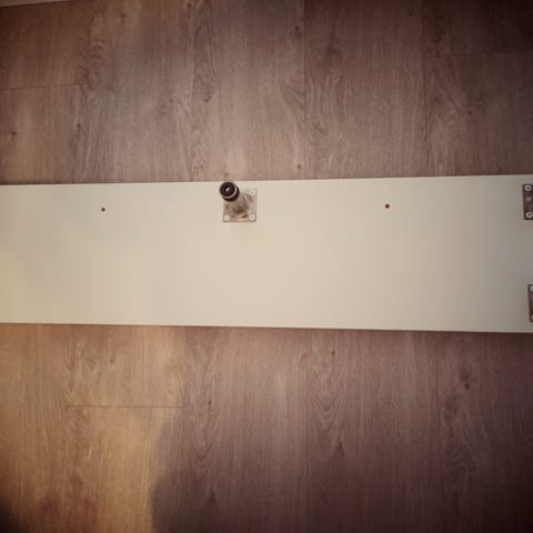 Säilytyslaatikollinen näyttökoroke, jossa valkoinen taso ja puunvärinen runko. Malli Ikean Elloven.