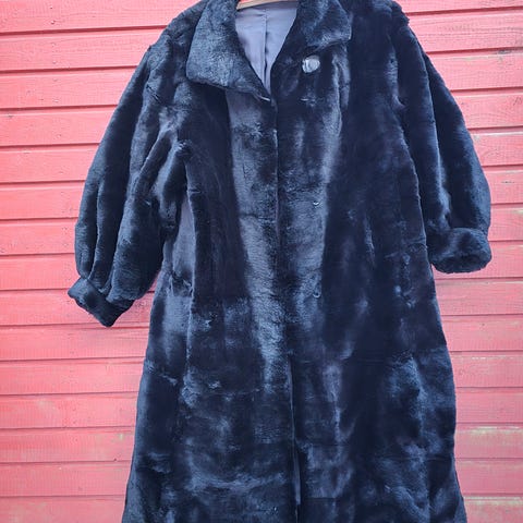 Pitkä keinomokka-takki koko 40 lämpimällä karvavuorella
