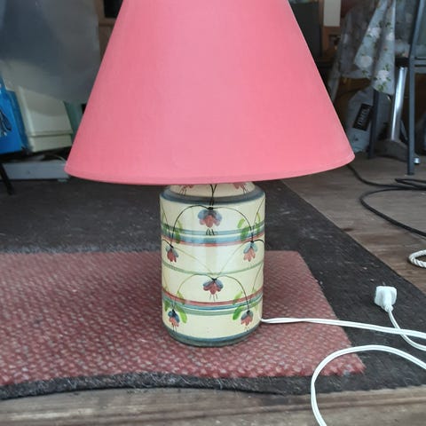 Toimiva vintage pöytälamppu. Kupittaan saven keramiikkaa. Art Deco -tyyppinen koristelu. Korkeus metallikannan kanssa 28 cm. Pallon halk. 20cm. Mieluiten nouto, mutta sopivasti sattuen voi myös kulkeutua menojen mukana.