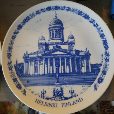 Arabia Helsinki-lautanen koristelautanen. Lautasen etupuolella on talvinen kaupunkimaisema, jossa näkyy rakennuksia ja kirkko sekä jalankulkijoita kadulla. Takapuolella on monikielinen teksti, jossa kerrotaan lautasen kuva-aiheesta ja sen taustasta. Lautanen soveltuu keräilyyn tai sisustuskäyttöön esimerkiksi seinälle tai tasolle asetettavaksi.Nouto tai postitus.Käteinen tai mobilepay.