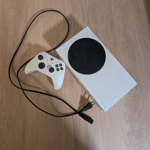 Microsoft Xbox Series S pelikonsoli valkoisena värinä. Kompakti digipainotteinen konsolimalli, jossa ei ole levyasemaa. Mukana kuvassa näkyvä ohjain ja virtajohto. Ja hinnasta voi tinkiä jos se painaa mieltä